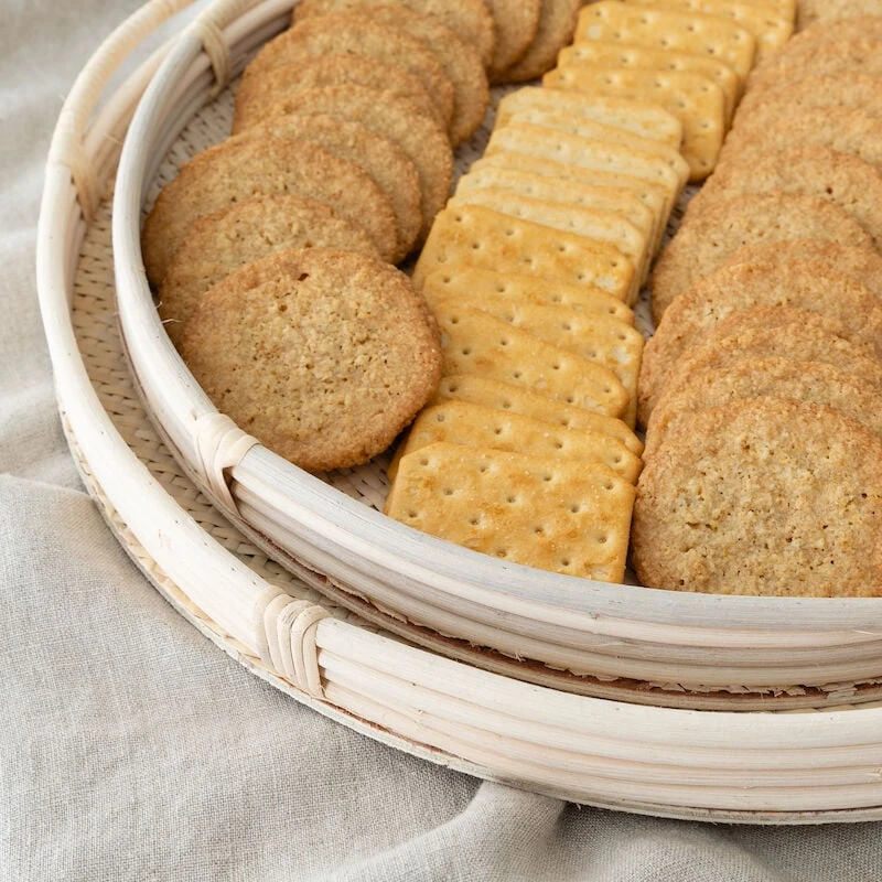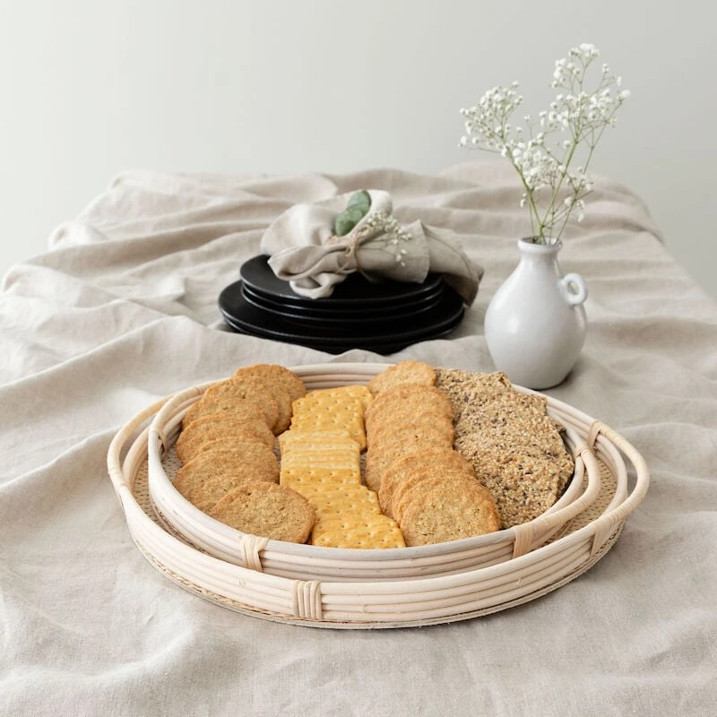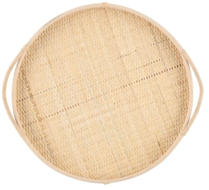 Kaunis, matalareunainen 4Living Dreamy tarjotin pyöreä on valmistettu punotusta bambusta. Setti sisältää kaksi erikokoista tarjotinta. Pienemmän tarjottimen koko on 39,5x35x3 cm ja suuremman tarjottimen koko on 45×39,5×3 cm. Tarjottimen reunassa pienet kantokahvat. Kaunis luonnonväri.