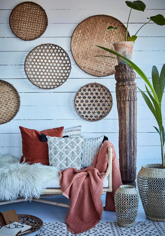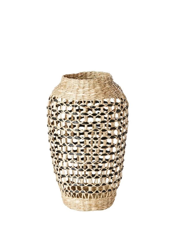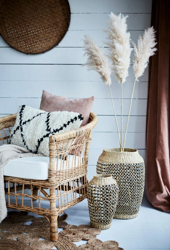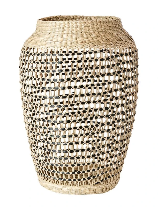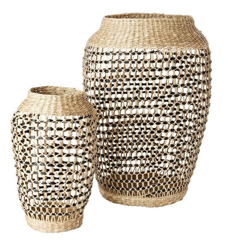 Näyttävä, boheemiin tyyliin sopiva Affari Collect korisetti, jossa on kaksi eri kokoista koria. Materiaalina meriheinä, väri luonnonväri/musta. Korien mitat, pienempi: korkeus 35 cm, halkaisija 20 cm, isompi: korkeus 50 cm, halkaisija 30 cm. Koreihin voi sijoittaa esimerkiksi trendikästä kuivattua pampaheinää, kasvin tai pitää tyhjillään, on kaunis myös niin.