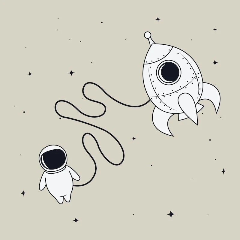 Vaalealla taustalla astronautti leijailee raketin kanssa avaruudessa. Sopii nykyaikaiseen sisustukseen muiden avaruusaiheisten julisteiden kanssa.