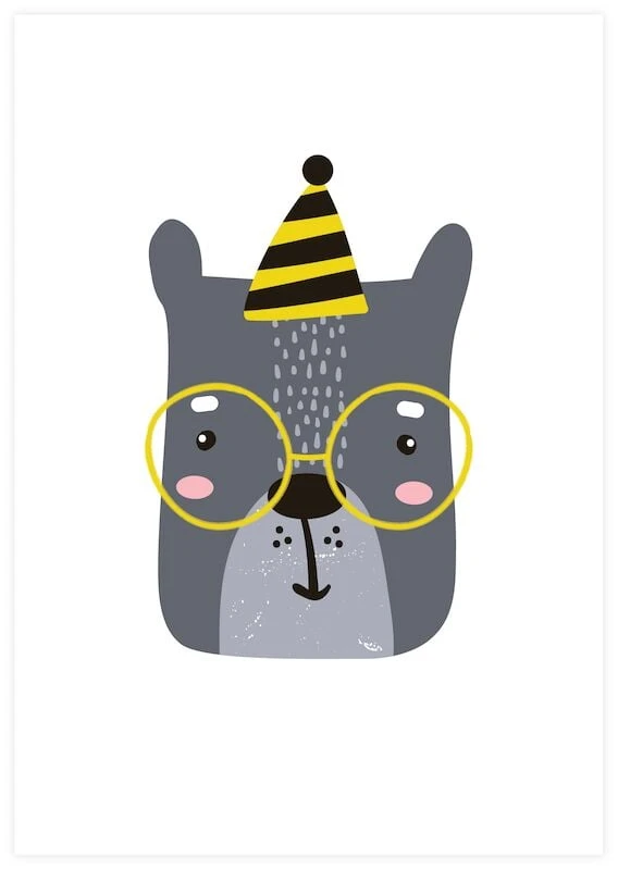 VĂ€rikkÀÀssĂ€ julisteessa karhu katselee hauska raitahattu ja rillit pÀÀssĂ€. Hanki julisteeseen kehykset ja laita ilostuttamaan lastenhuoneen sisustusta. Julisteen koko 21×30 cm..