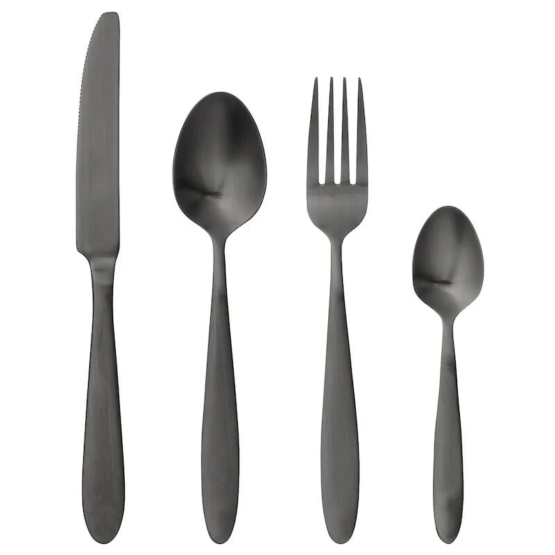 Upea ja tyylikäs musta aterinsetti jokapäiväiseen kattaukseen. Aterinsetti sisältää kuvan mukaiset ruokailuvälineet 4 kpl. Soveltuvat ruokailukäyttöön. Ei sovellu astianpesukoneeseen. Ruostumatonta terästä.
