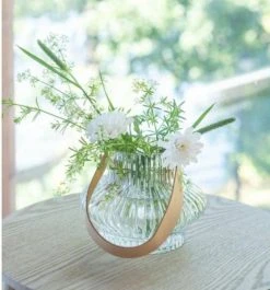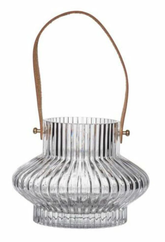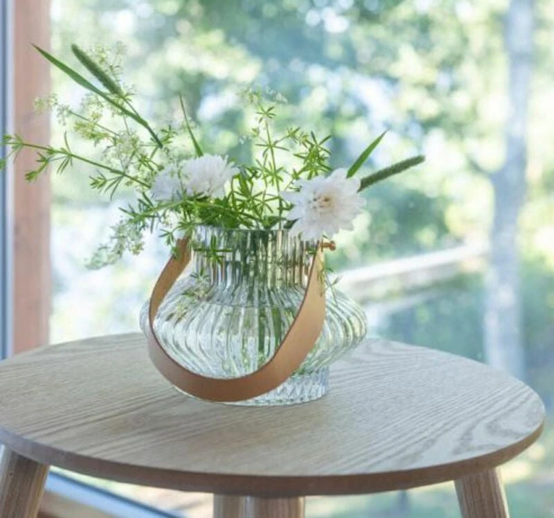 Kauniisti muotoiltu Fanni K Lampi maljakko on kirkasta vekitettyä lasia. Kauniina yksityiskohtana maljakossa on keinonahkainen kahva.