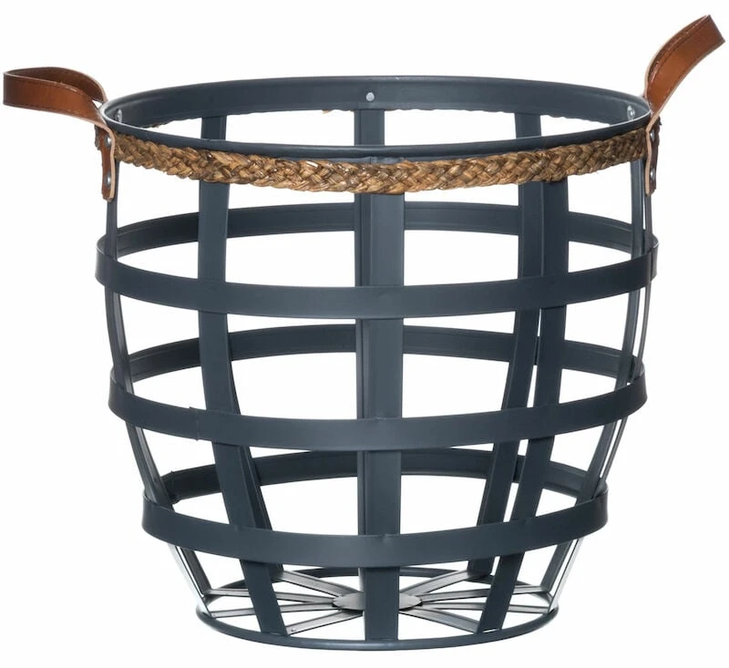 Tukeva kori jossa vankat nahkaiset kahvat. Isomman korin halkaisija 43 cm, korkeus 36,5 cm ja pienemmän korin halkaisija 35,5 cm, korkeus 33 cm. Sora korit sopivat hyvin esim. eteiseen tai lastenhuoneeseen.