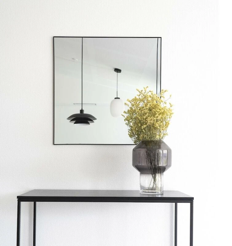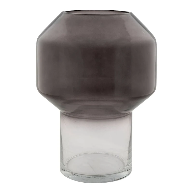 Moderni ja näyttävä lasinen vaasi erilaisille kukka-asetelmille. Vaasin yläosa on savunharmaata, alaosa kirkasta lasia.