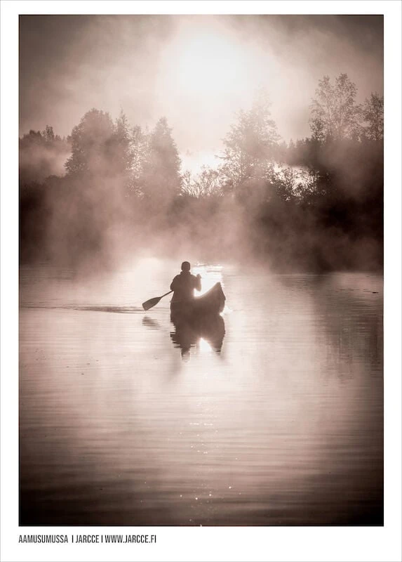 Jarccen Aamusumussa julisteessa kuvaaja on saanut ikuistettua ihanan maiseman, kanootissa liukuen pitkin jokea. Kuvaushetkellä pikkulinnut ovat viserrelleet kilpaa ja kuvaajan on muutaman kuvan jälkeen täytynyt jättää kamera rannalle ja vain tunnelmoida tästä upeasta maisemasta. Tämän uskomattoman aamun voit saada nyt vaikka makuuhuoneesesi seinälle.