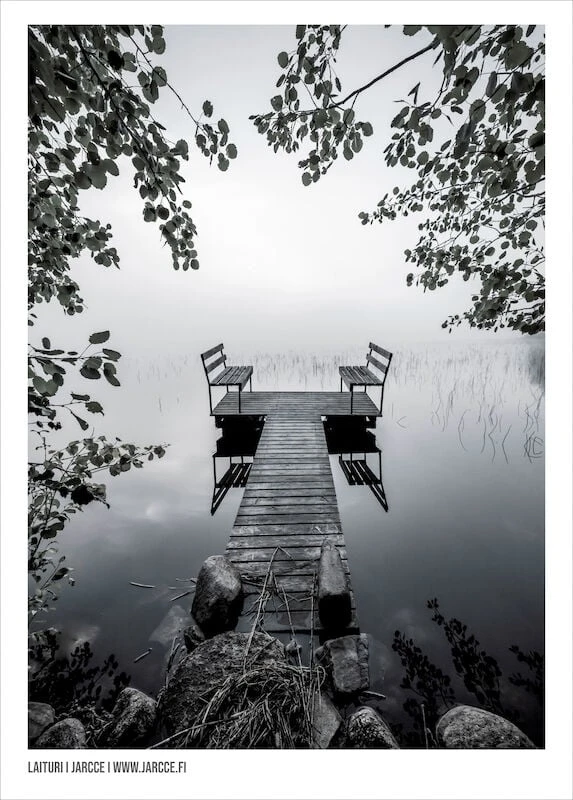Jarccen Laituri julisteessa on ihanat värit ja sen taustalla on hauska sattuma. Jokainen meistä on joskus ihastellut kesäistä luontoa laiturilta. Laituri kuvassa piti olla selkeä loppukesän auringonnousu, mutta onneksemme luonto on täynnä yllätyksiä ja sankka aamusumu toi kuvaan ihanan oman tunnelmansa.