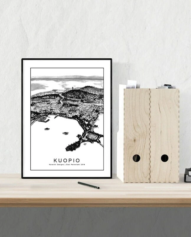 Maalauksellinen maisema kuljettaa katsojan Kallaveden rannalle Kuopioon. Kuopio on keskeinen matkailukaupunki Pohjois-Savon maakunnassa, mikä on Järvi-Suomen sydänmaata. Tämä kaupunkijuliste on Essi Peltoniemen käsin maalama vesiväriteos, josta on painettu juliste Vihannissa. Julistepaperina on käytetty on 200 grammaista ja korkealaatuista paperia. Saatavilla kaksi eri kokoa.