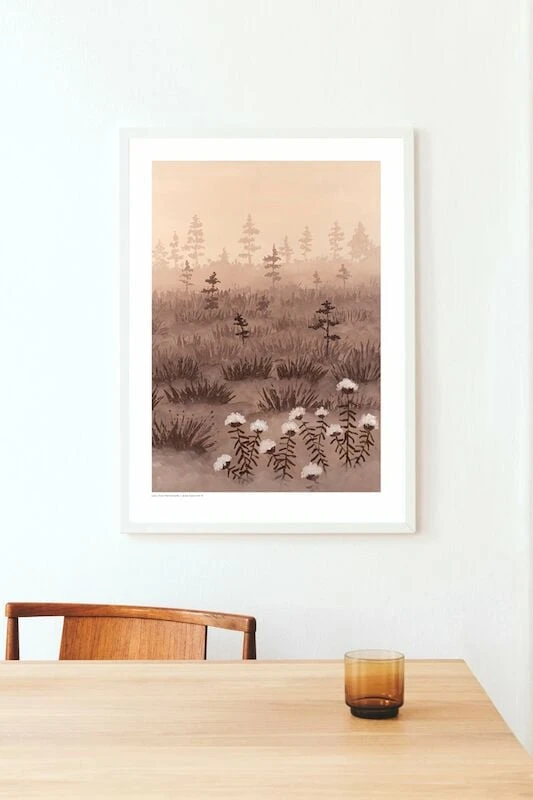 Essi Peltoniemen tekemä ihana juliste Suosta. Juliste on maalattu kankaalle palettiveitsellä ja pesusienellä. Julisteen etuosassa on suopursuja ja väri vaihtelee julisteissa ruskean ja beigen sävyjen välillä. Sävyä ei voi valita ostaessa. Painatettu Suomessa laadukkaalle suomalaiselle paperille. Juliste toimitetaan kartonkikuoreen pakattuna.