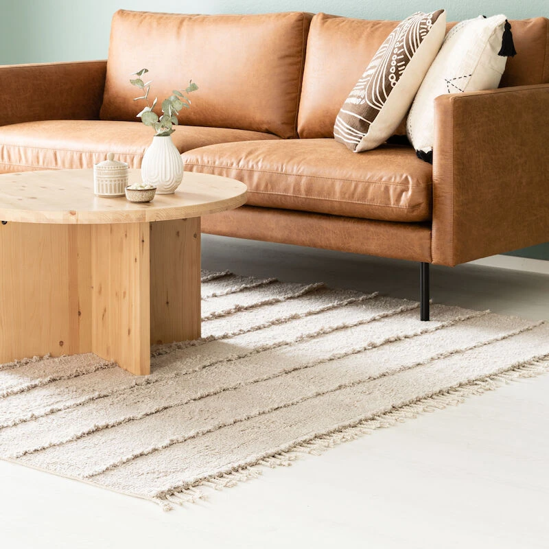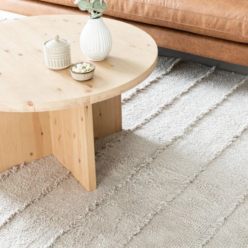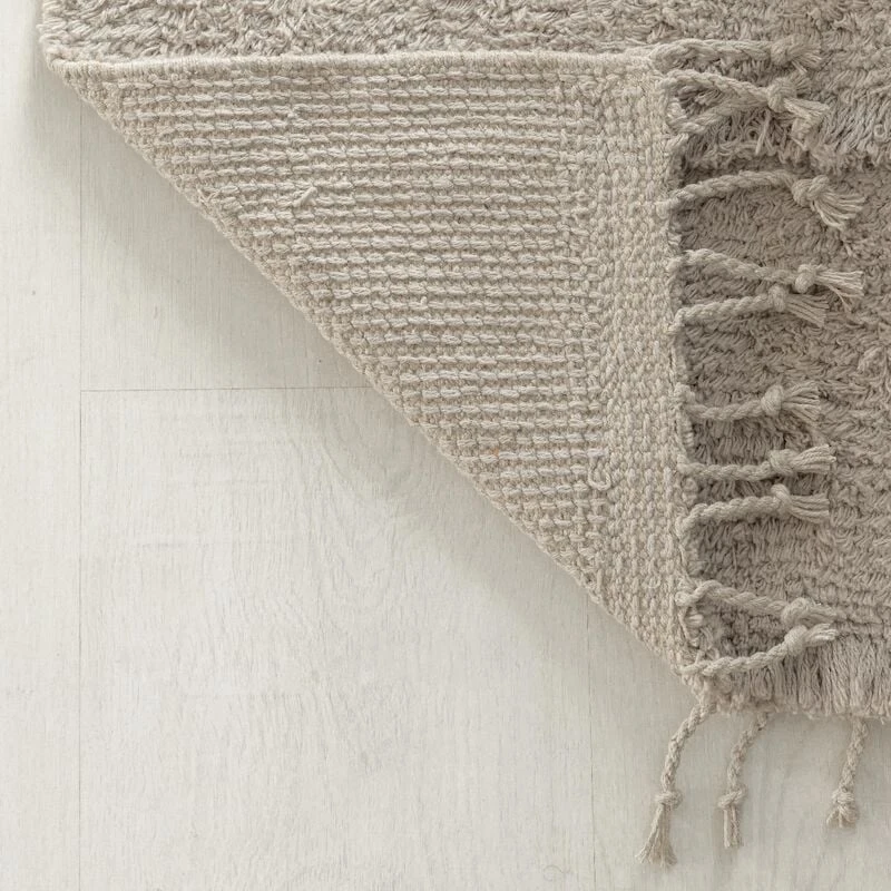 Tuohi -puuvillamatto on ihanan pehmyt jalalle. Neutraalit, luonnonläheiset sävyt tuovat rauhallista tunnelmaa sisustukseen. Punotut hapsut maton päädyissä, sekä pidemmät nukkaraidat pinnassa tekevät matosta rennon eläväisen näköisen.