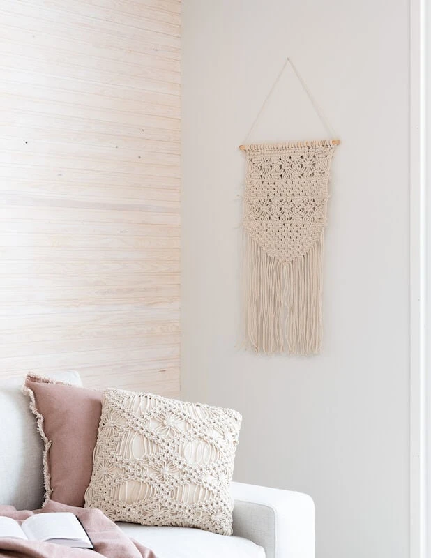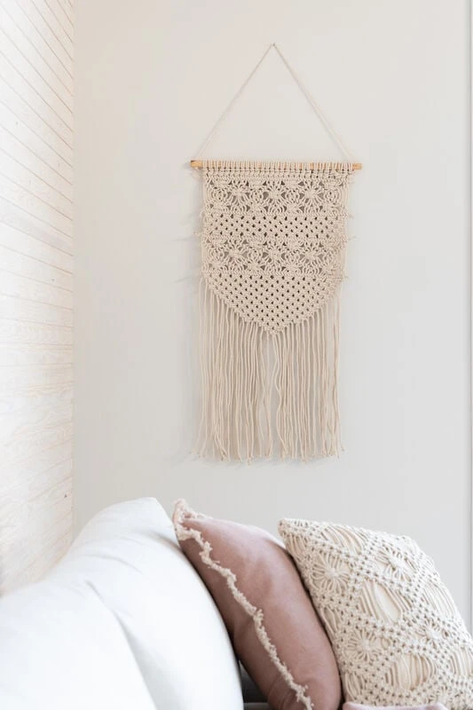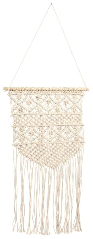 Kaunis luonnonvalkoinen Makrame-seinävaate. Ripusta koristeeksi sängyn päätyyn tai katseenvangitsijaksi kodin paraatipaikalle. Seinävaatteella luot lämmintä tunnelmaa kotiin. Sopii käytettäväksi monenlaiseen sisustukseen. Koko 40×80 cm.
