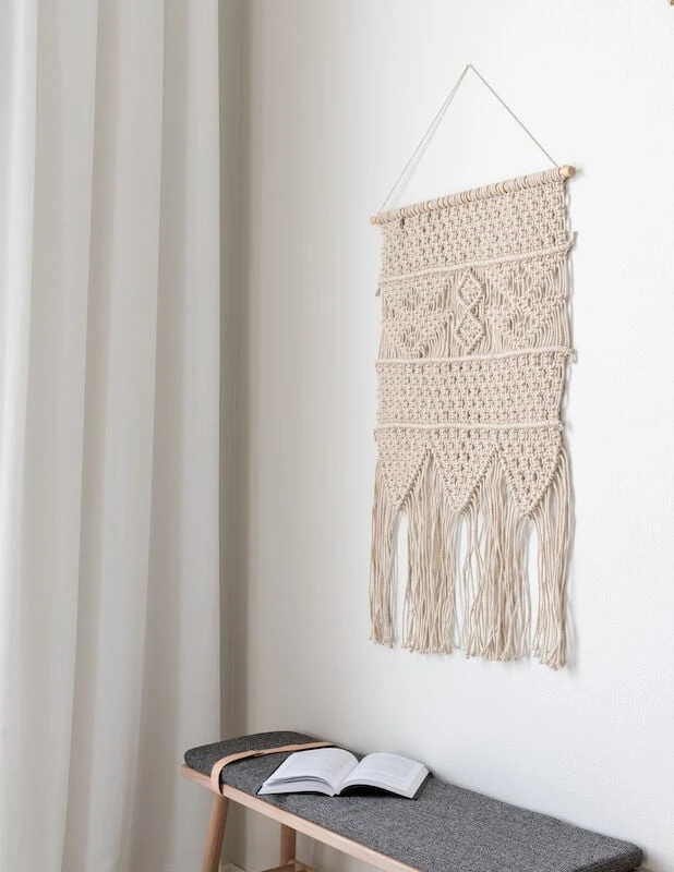 Kaunis luonnonvalkoinen Makrame-seinävaate. Ripusta koristeeksi sängyn päätyyn tai katseenvangitsijaksi kodin paraatipaikalle. Sopii monenlaiseen sisustukseen.