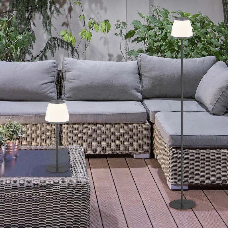 Domingo ulkolattiavalaisimella luot viimeisen silauksen terassille tai parvekkeelle. Valaisin on ladattava, latausaika on 3,5 tuntia ja käyttöaika täydellä latauksella jopa 7 tuntia. Pakkauksen mukana tulee latausjohto ja pistotulppamuuntaja. Domingossa on 3-portainen hipaisukytkin kuvun päällä, jonka avulla valoa voi himmentää tarpeen mukaan. Valaisinosa on irrotettavissa jalasta ja se voidaan ripustaa vaikka seinälle tai puuhun. IP44 kotelointiluokka tarkoittaa sitä, että tuote on suojattu roiskuvalta vedeltä + kappaleita vastaan, joiden halkaisija on 1 mm tai suurempi. Suojausluokka 3.