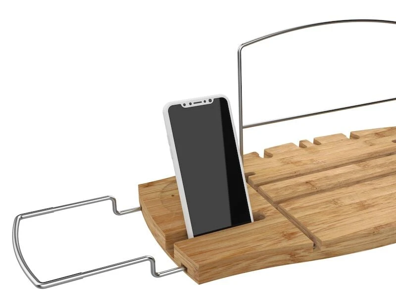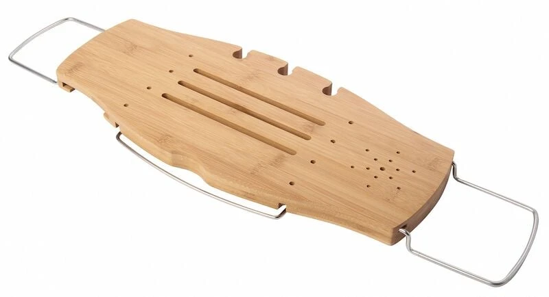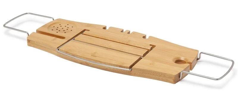 Haluatko viedä kylpykokemuksesi uudelle tasolle? Umbran Aquala telineellä se onnistuu. Telineessä on mm. pidike viinilasille, kirjalle tai tabletille sekä puhelimelle. Pyöreälle alustalle voi laittaa esimerkiksi vesilasin tai kynttilän. Luonnonvärisen telineen materiaalina on bambu ja saksanpähkinän materiaali kumipuu. Teline on säädettävä ja sen saa levitettyä 94 cm asti, joka mahdollistaa käytön eri kokoisten ammeiden kanssa. Pidennettävissä krominvärisissä metallivarsissa on silikoni / kumipinnoite, joka estää telineen liukumista.