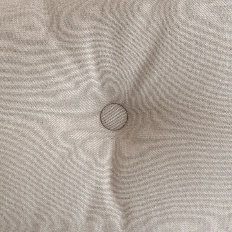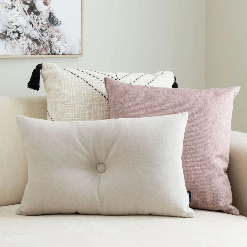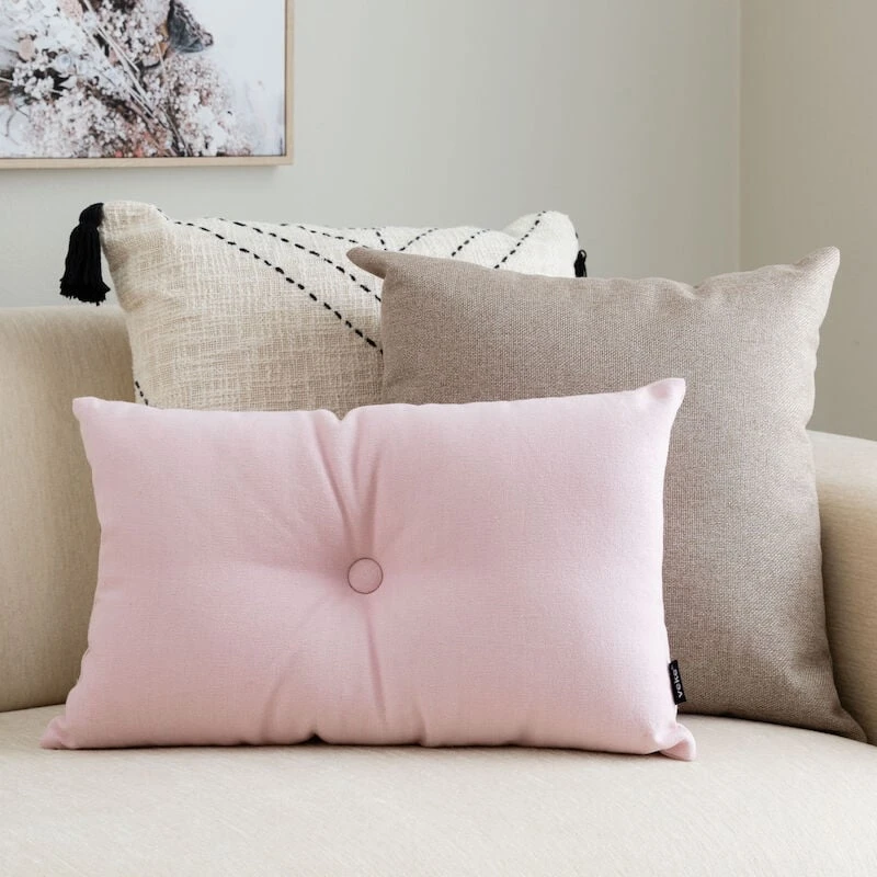 Tiuku koristetyyny on valmistettu vahvasta puuvillakankaasta, jonka eläväinen pinta on kudottu kahdesta lankaväristä. Söpössä tyynyssä on samalla kankaalla päällystetty nappi keskellä. Tyynyn voi vesipestä kokonaisena, pelkkää päällistä ei voi irrottaa.