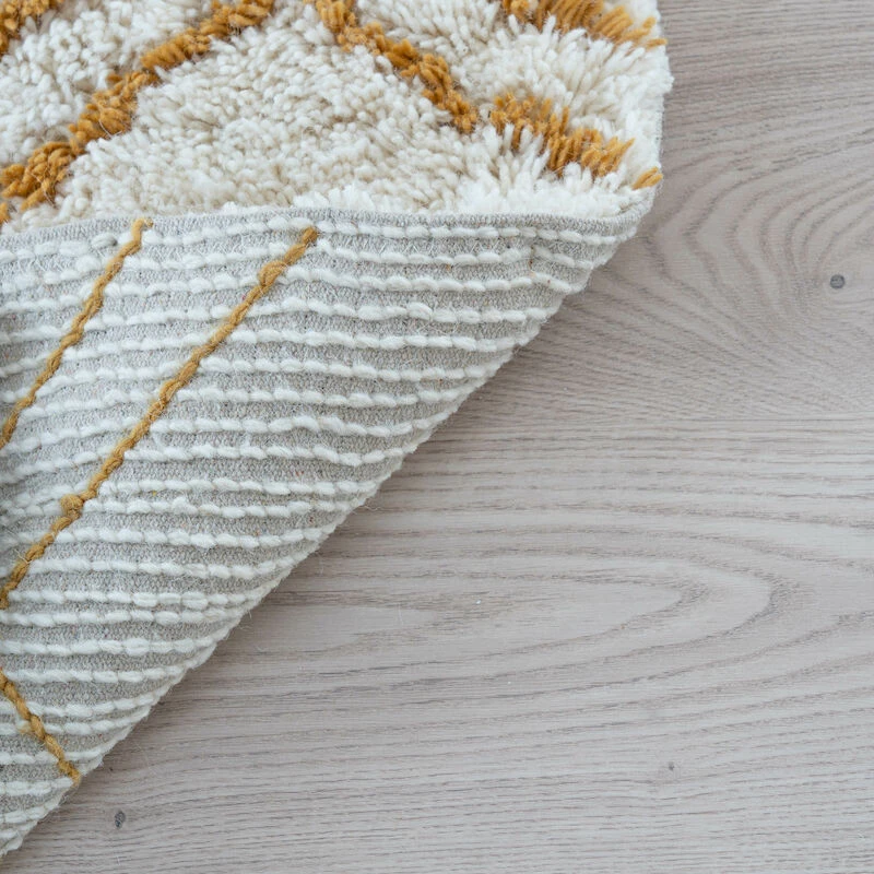 Paksu ja pehmeä käsinkudottu villamatto, jonka luonnonvalkoisella pohjalla kaunis okrankeltainen kuviointi. Matto on kudottu lyhyistä villakuiduista, jonka vuoksi matosta irtoaa aluksi nukkaa, mutta tämä vähenee kun matto tiivistyy käytössä.