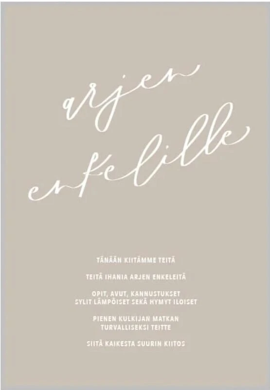 Xeraliving ARJEN ENKELILLE kortti sopii tärkeää työtä tekeville. Kiitokseksi arjen sankareille päiväkotiin, kouluun, kerhoon, esikouluun jne. Kortissa kaunis kalligrafia ja herkkä teksti. Kortissa käytetty paperi on FSC- ja PEFC-sertifioitua. Käytetty puuaines tulee vain vastuullisesti hoidetuista metsistä. Kortin on suunnitellut Jenni Hakkarainen.
