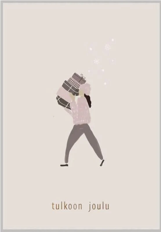 Moderni joulukortti leikkisällä designillä ja herkillä väreillä. Mattapainetulla taustalla ruusukultainen folioitu teksti. Kortissa käytetty paperi on FSC- ja PEFC-sertifioitua. Käytetty puuaines tulee vain vastuullisesti hoidetuista metsistä. Kortin on suunnitellut Jenni Hakkarainen.